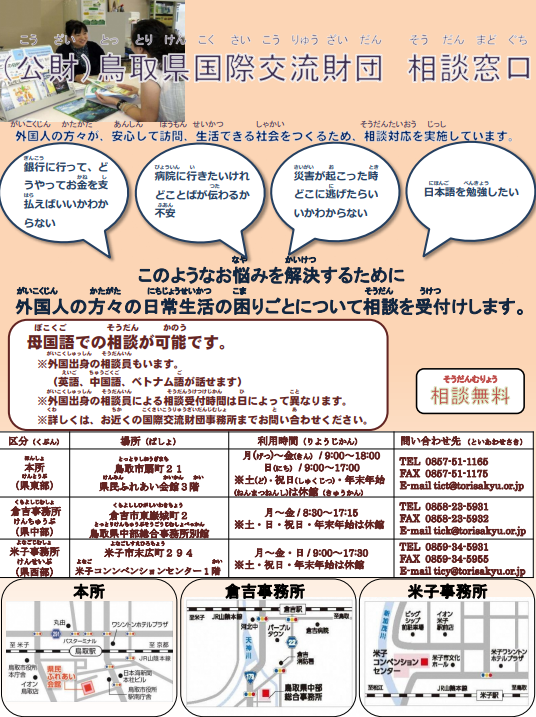 県内3箇所にある(公財)鳥取県国際交流財団に、外国人の相談を受け付けする窓口を設置し、必要に応じて専門機関を紹介しています。