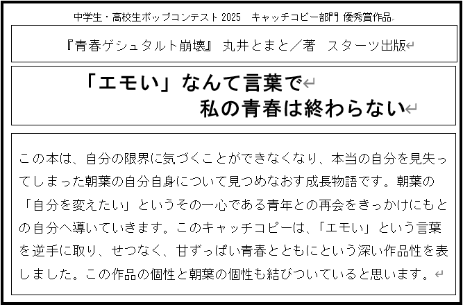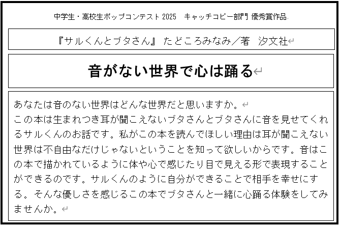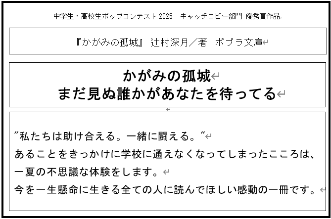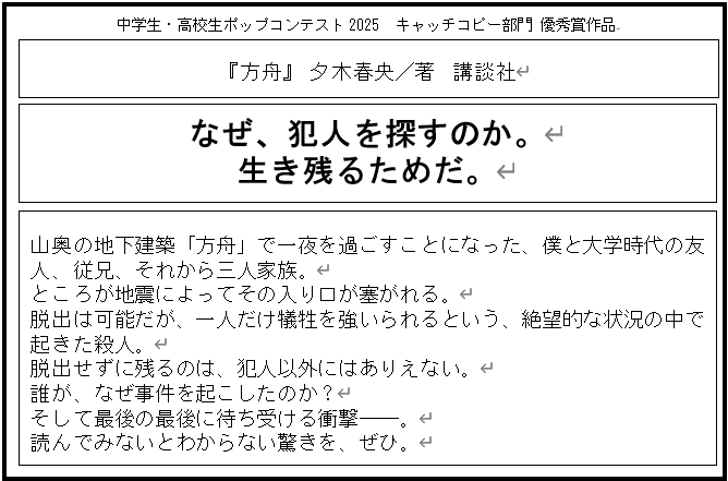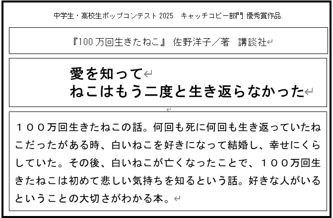 - 審査員コメント:本のタイトルに対する、とても印象的なキャッチコピー。どんな物語なのかとても引き付けられる。文字中心だが、すっきりとうまくまとめられている。