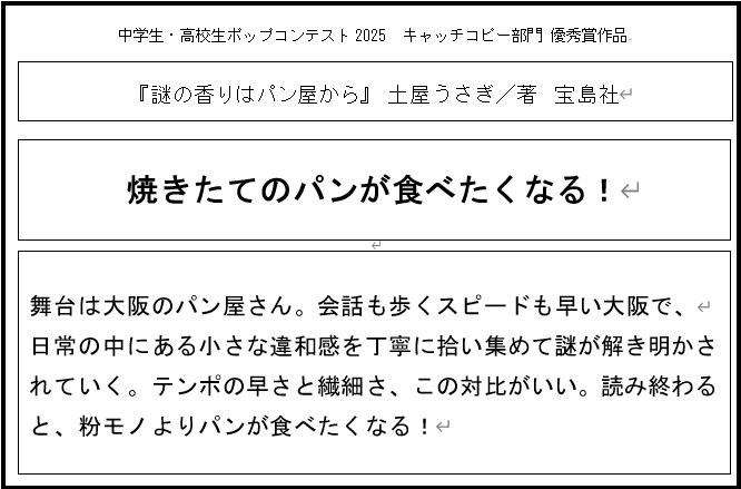 - 審査員コメント:美味しそうなパンの絵にまず興味を惹かれます。ミステリーなのにほっこりとする内容の本に相応しいPOPです。