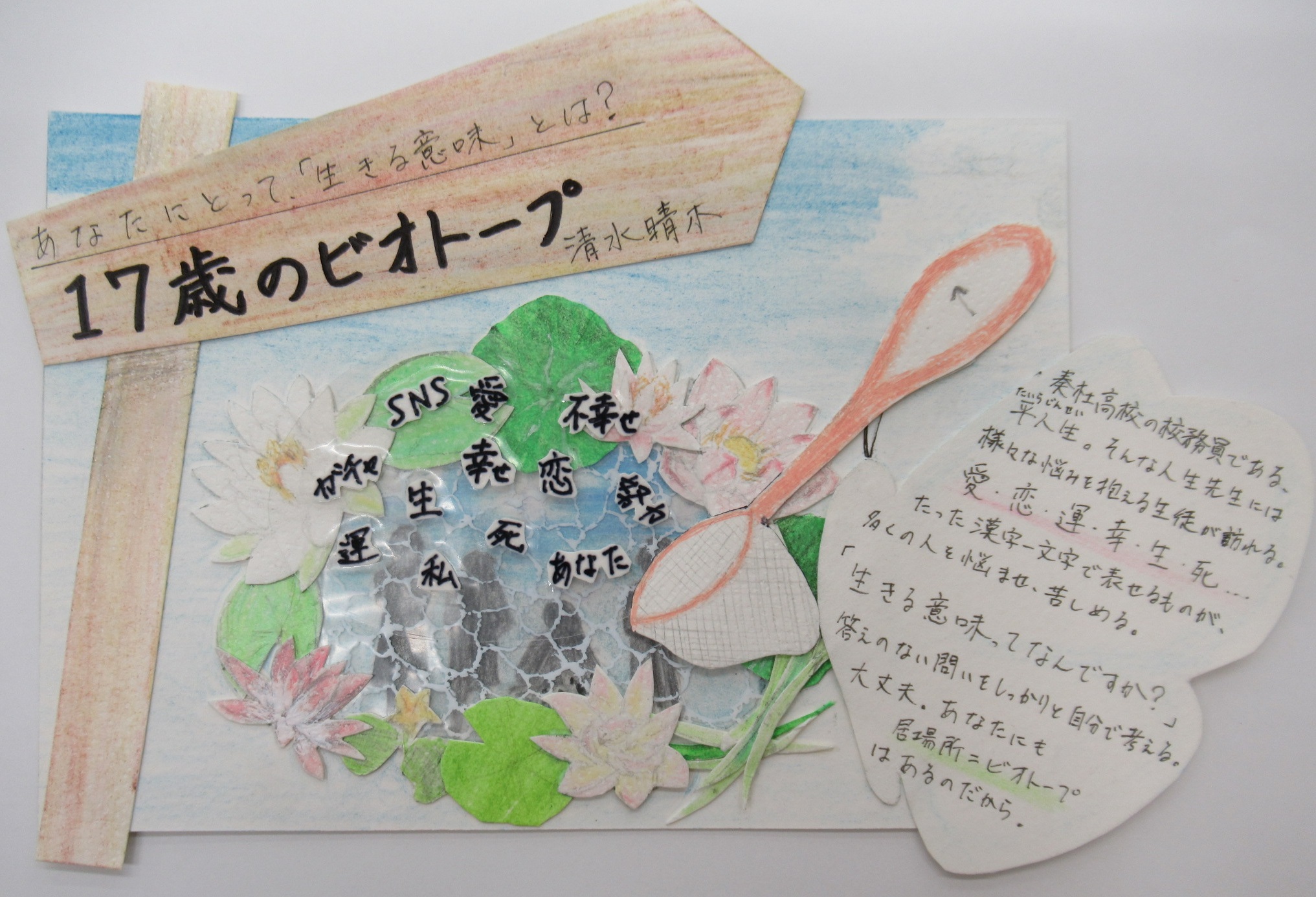 - 審査員コメント:物語のキーワードとなる「ビオトープ」を自分なりにイメージし、イラストとして中央に配置するアイデア、すてきです。やわらかな色彩が、静かに温かく読者の背中をおしてくれるようです。