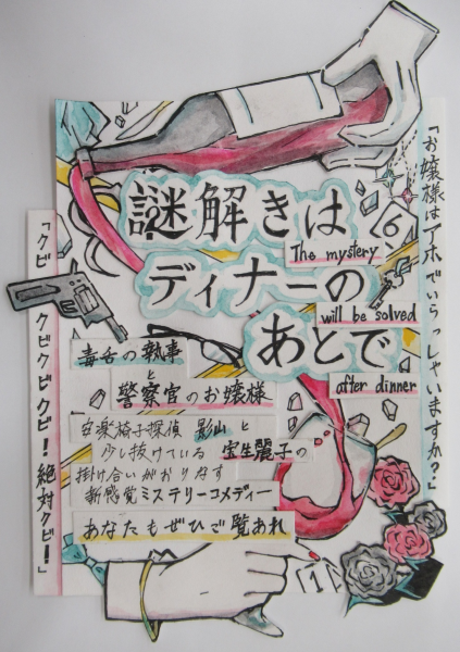 - 審査員コメント:背景にはお嬢様と探偵の執事を想像させるイラストで、その上にタイトル、コメントが同じような色で置かれているため、ややゴチャついた感はありますが、なぜか目を惹かれるような魅力を感じるポップです。