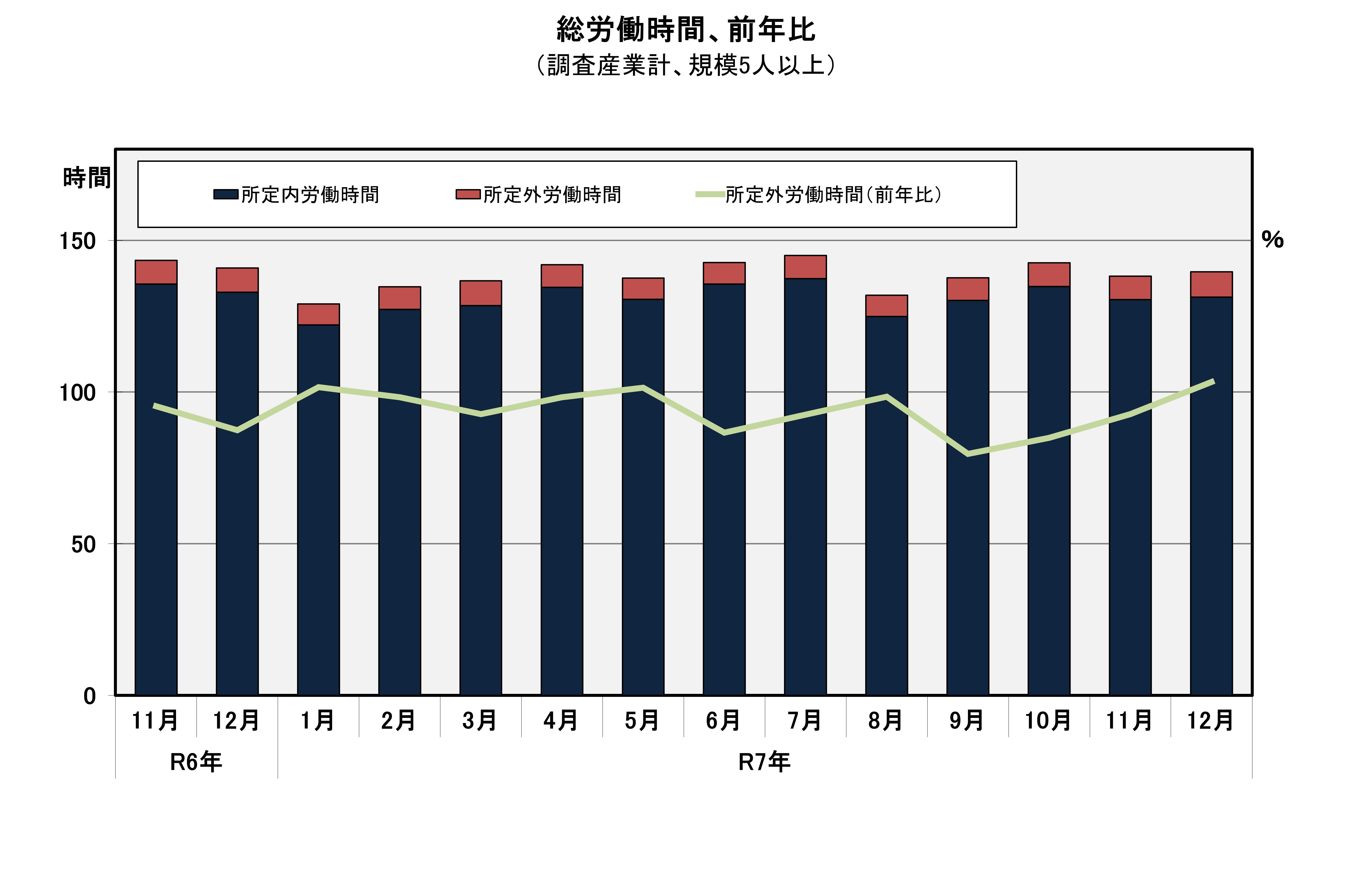 12月の総実労働時間は、規模5人以上で139.6時間となった。その労働時間指数は98.7で前年に比べ0.9%減(うち規模30人以上では144.4時間、その労働時間指数は99.2で前年に比べ0.2%増)となった。