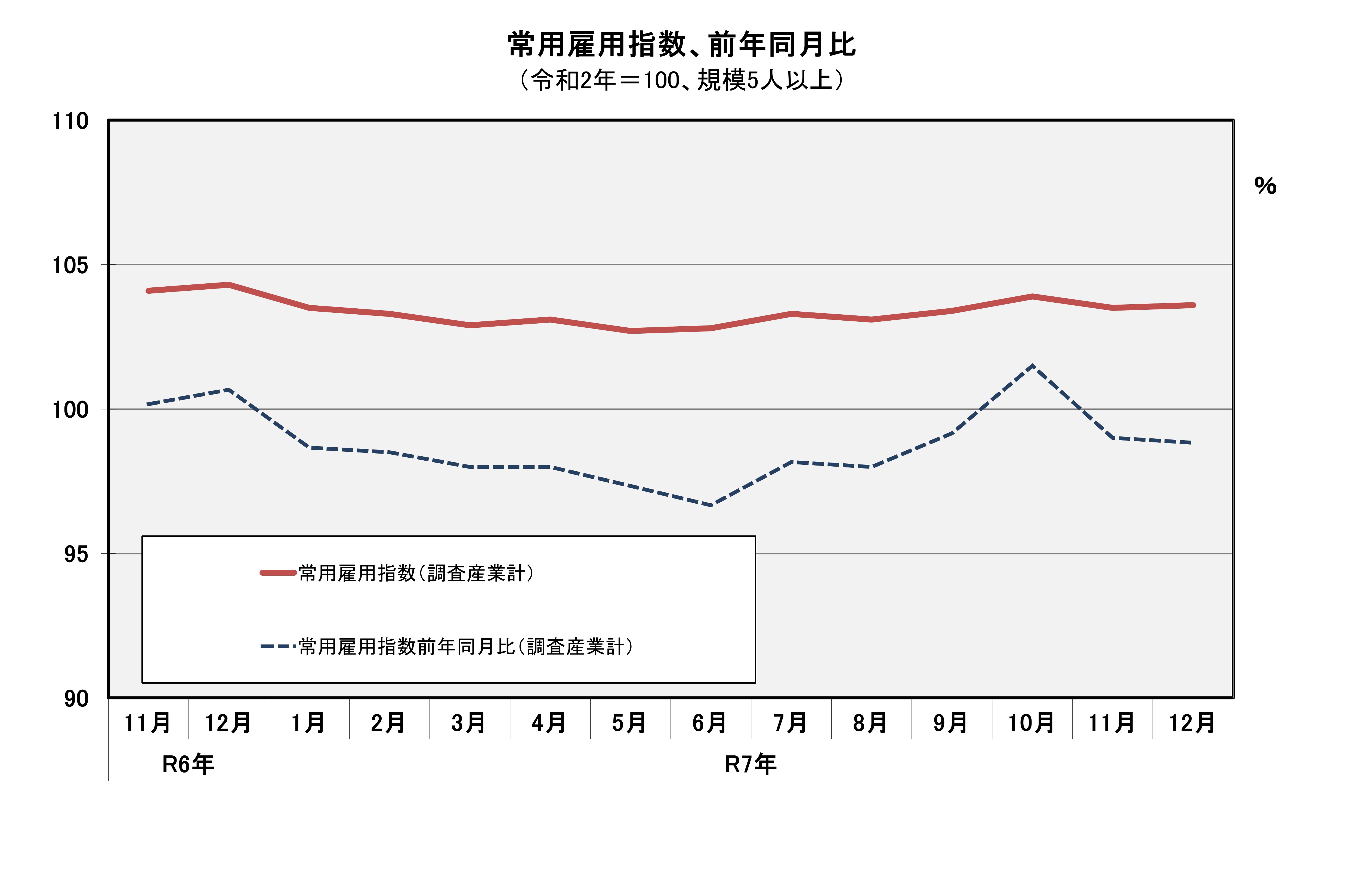12月末の常用労働者数は規模5人以上で193,338人となった。その常用雇用指数は103.6で前年に比べ0.7%減(うち規模30人以上では104,942人、その常用雇用指数は101.8で前年に比べ0.5%減)となった。