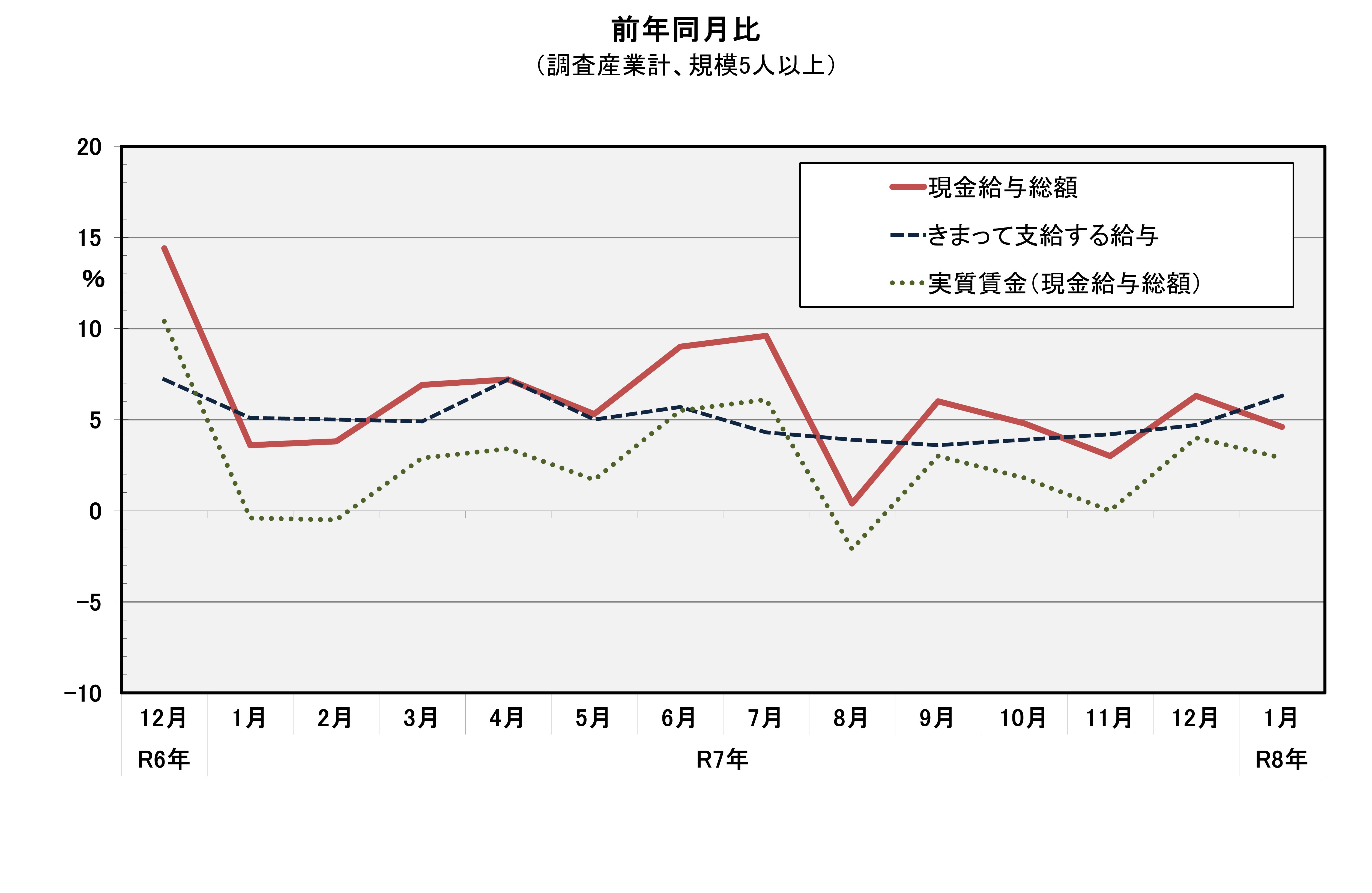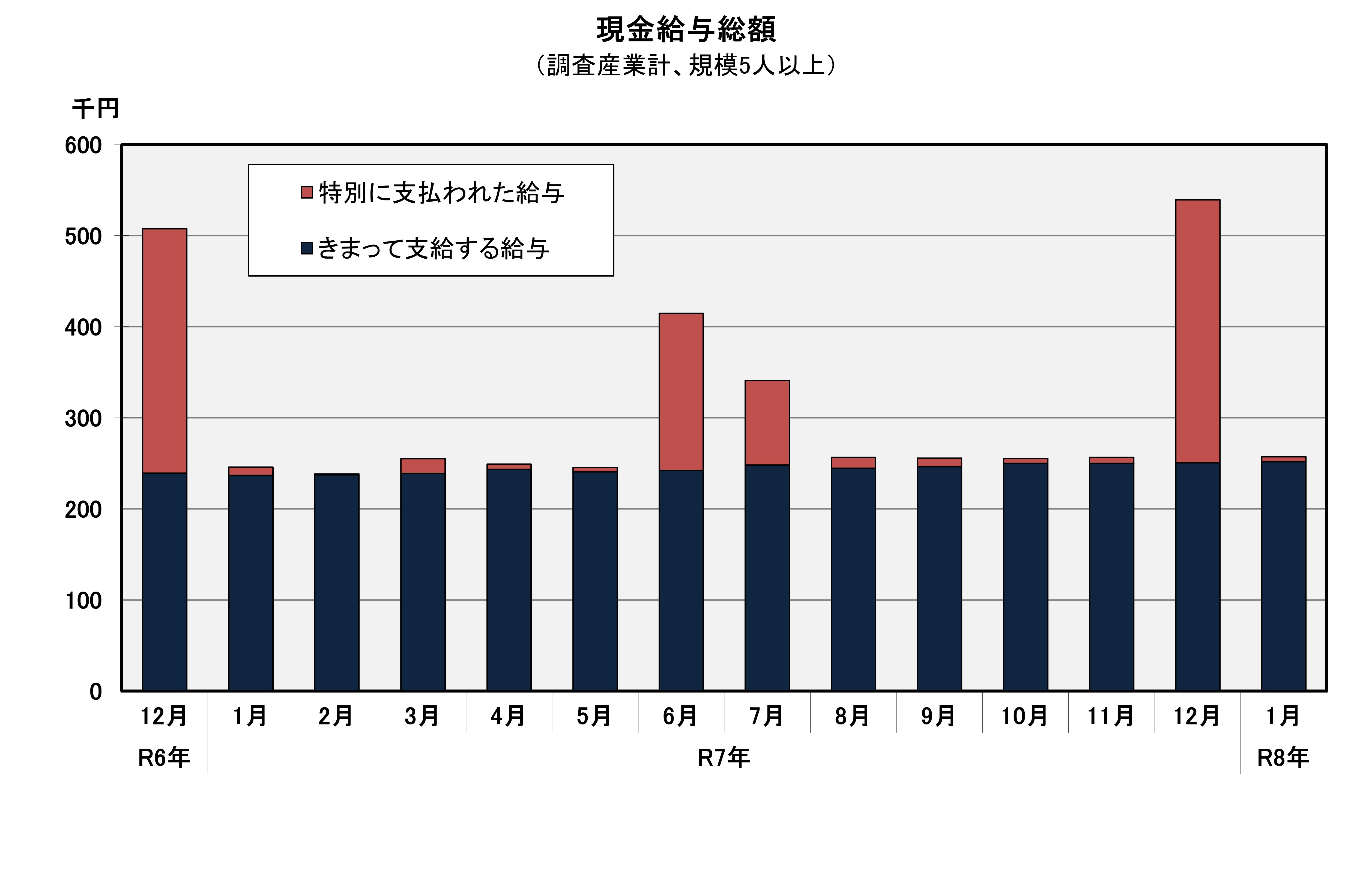 1月の現金給与総額は、規模5人以上で257,341円となった。その名目賃金指数は96.5で前年に比べ4.6%増(うち規模30人以上では263,989円、その名目賃金指数は89.2で前年に比べ2.8%増)となった。