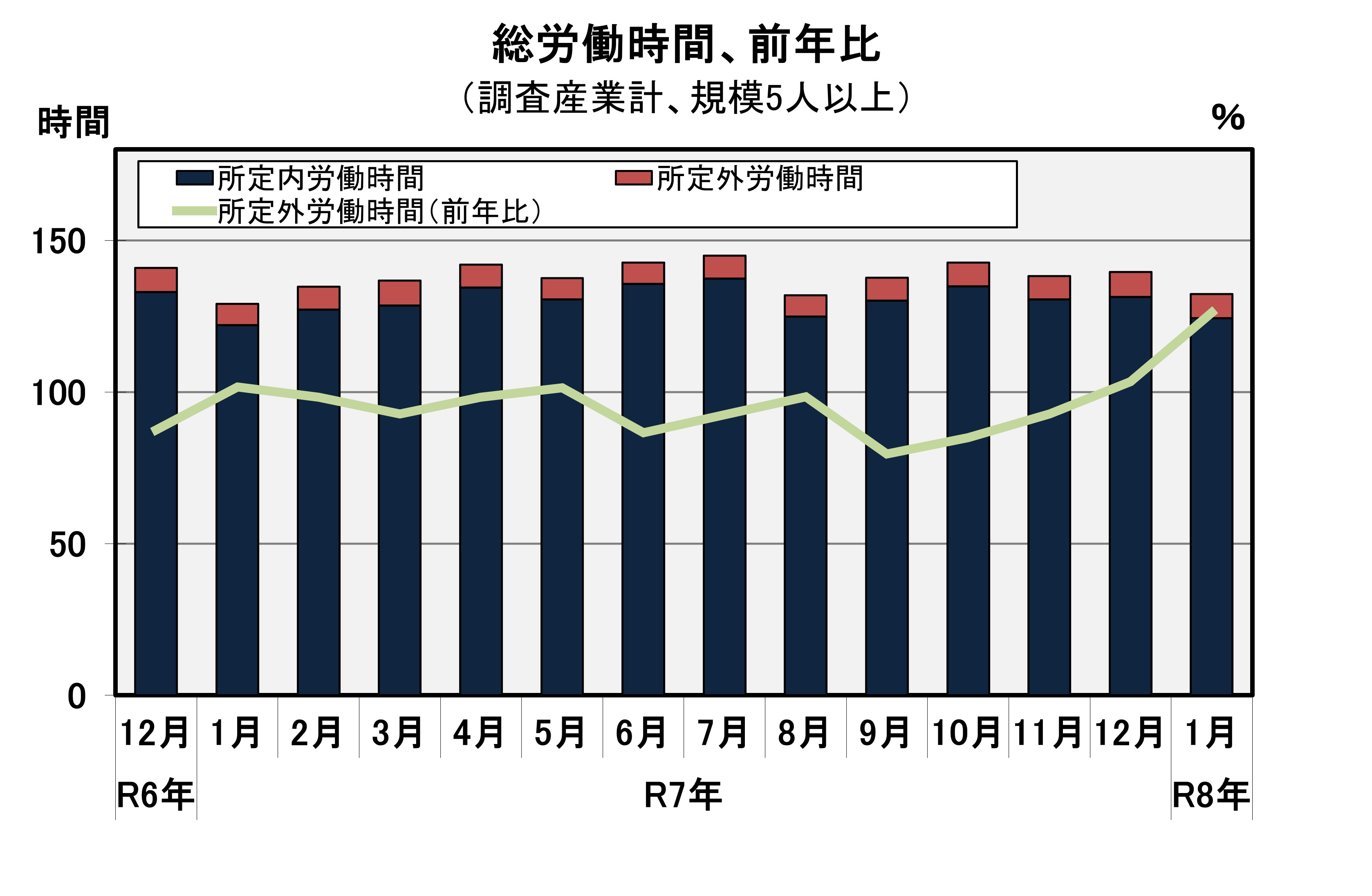 1月の総実労働時間は、規模5人以上で132.3時間となった。その労働時間指数は93.6で前年に比べ2.6%増(うち規模30人以上では136.0時間、その労働時間指数は93.4で前年に比べ2.0%増)となった。