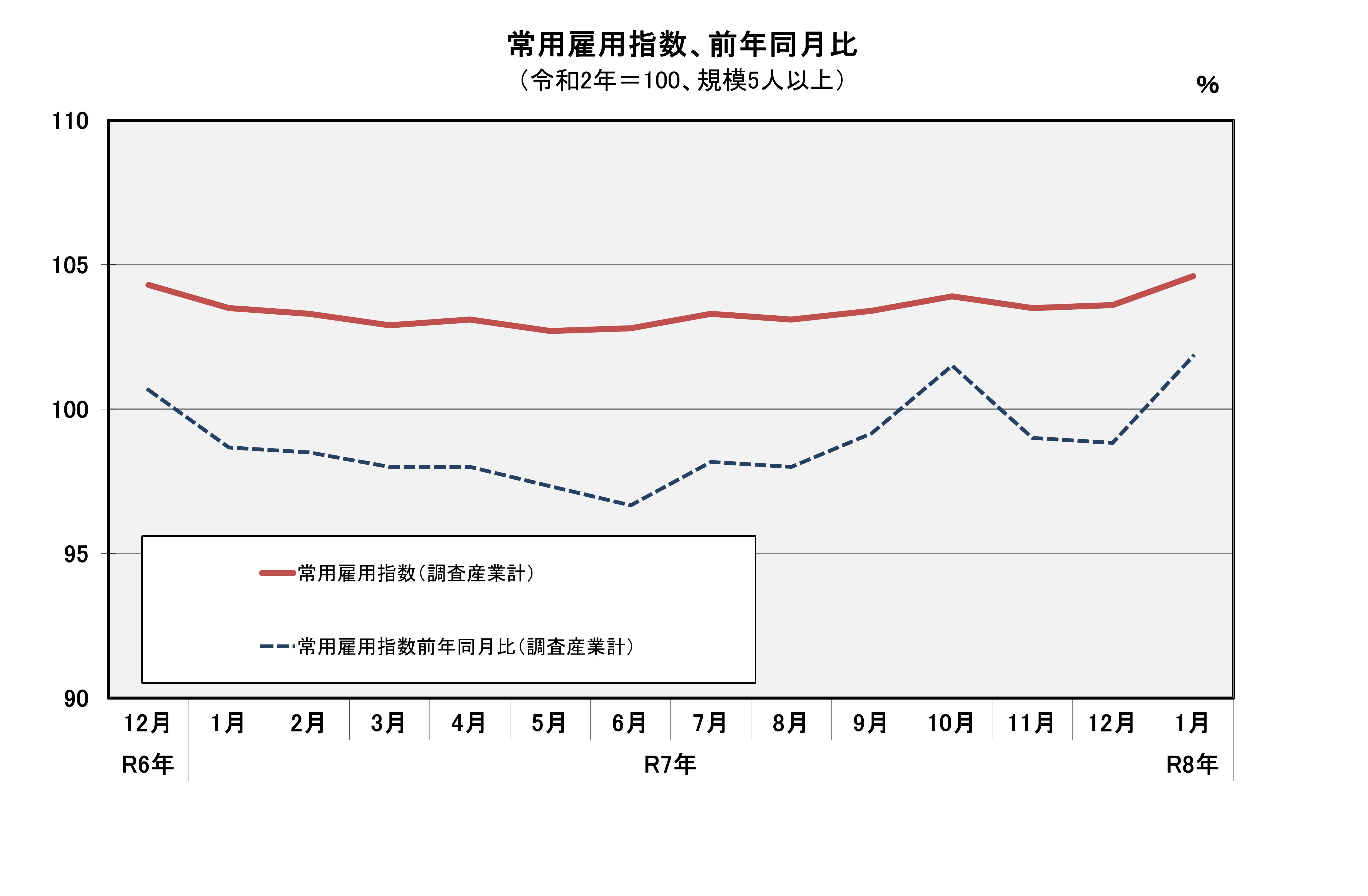 1月末の常用労働者数は規模5人以上で195,053人となった。その常用雇用指数は104.6で前年に比べ1.1%増(うち規模30人以上では103,520人、その常用雇用指数は100.4で前年に比べ1.5%減)となった。