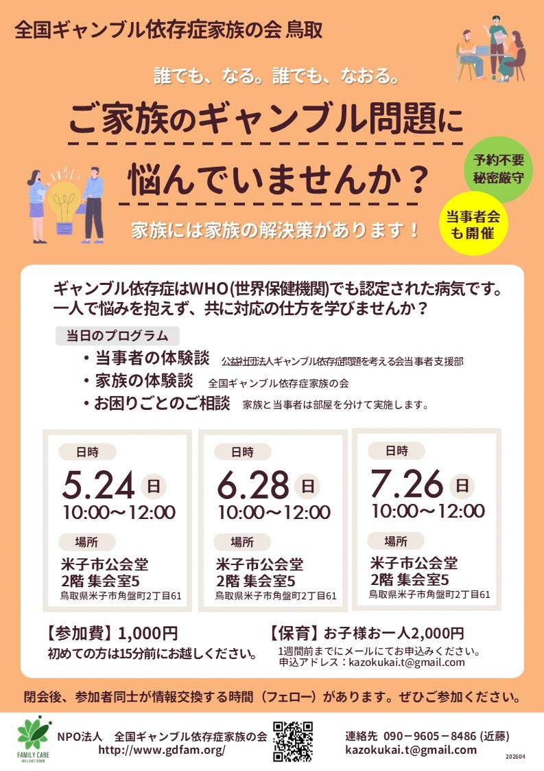 全国ギャンブル依存症家族の会鳥取は、ご家族のギャンブルなどの問題で困っている方、ご家族が現在依存症回復施設に入寮されている方、これから依存症回復施設の入寮を考えている方、ギャンブル依存症について詳しく知りたい方など、どなたでもご参加できる会です。