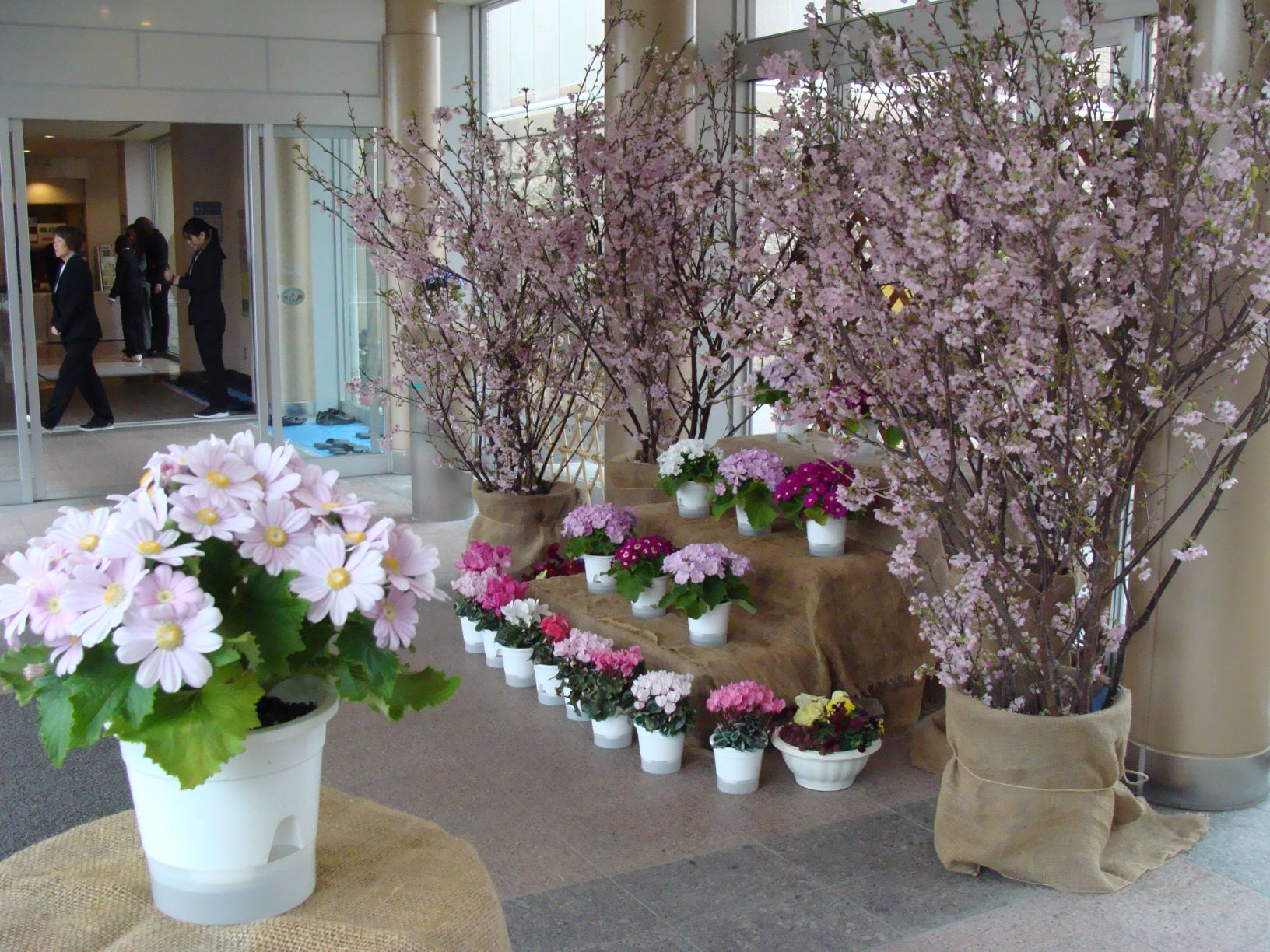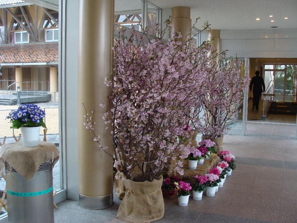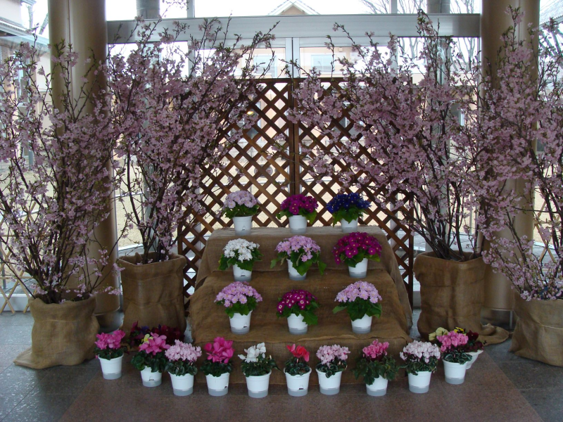 毎年恒例ですが、玄関付近は花きコースの学生・職員が総出で、この日に合わせて咲かした桜や栽培している花で見事に飾られてます。