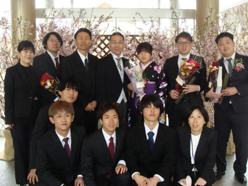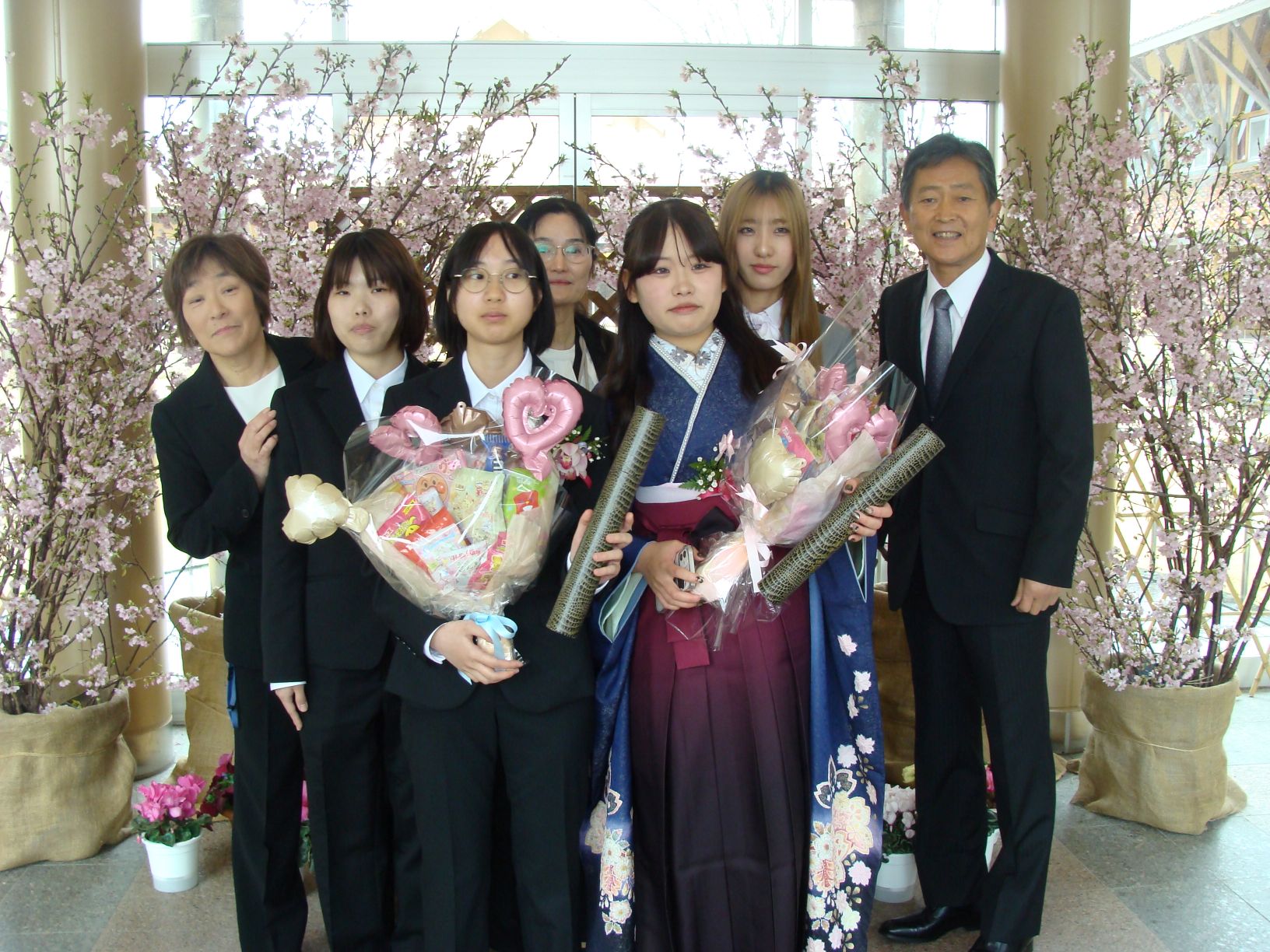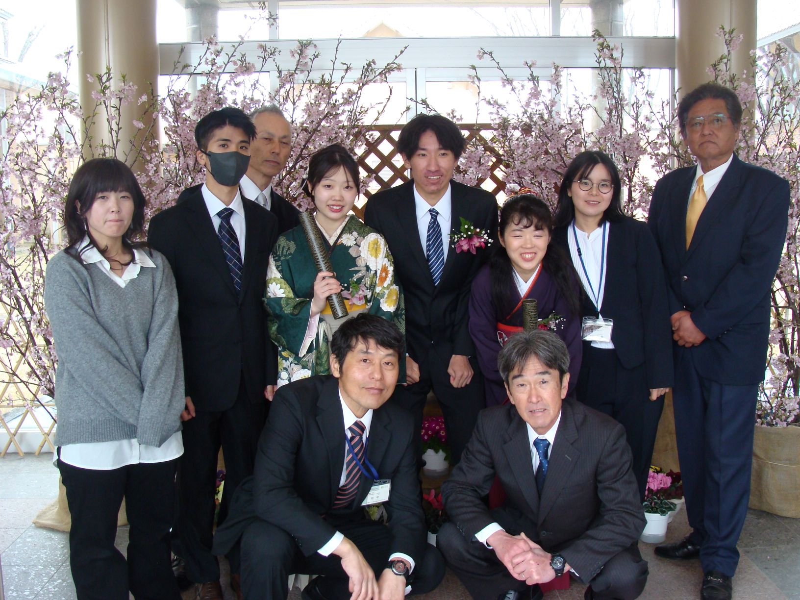 卒業式の全日程が終了した後、玄関前で専攻コースごとに記念撮影を行いました。