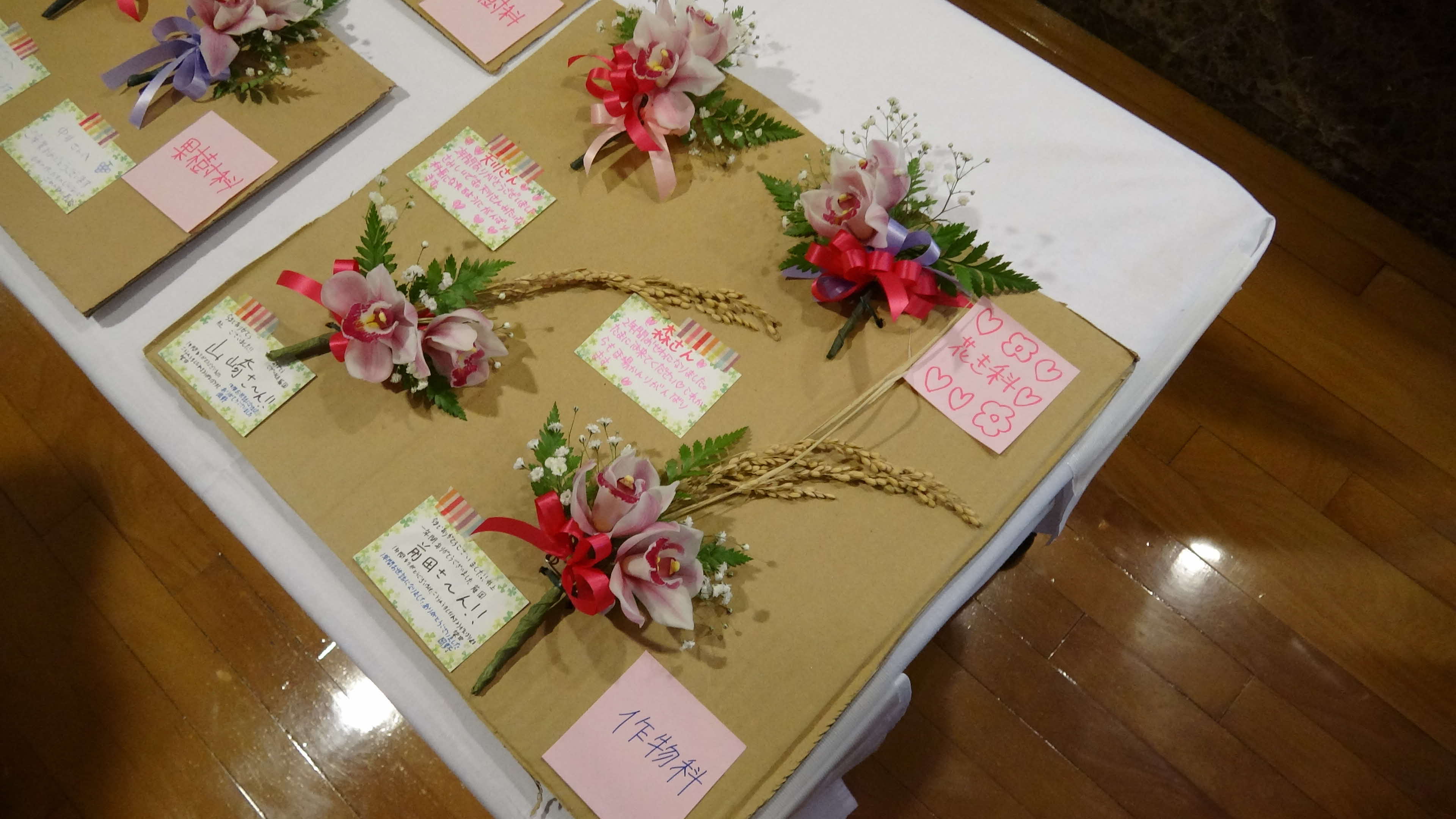 また、受付では1年生全員が思いを込めて作ったコサージュが並べてあり、卒業生にコサージュをつけてあげました。